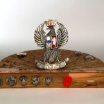 Il Masgalano della Damiani è un lavoro carico di sfumature ed estro, capaci di aggiungere nuovi significati a questo prezioso dono. Così come è ricca di significazione l’aquila, lo stemma dell’Associazione, modellato in plastilina e realizzato in argento con la tecnica della cera persa, in parte smaltata per riproporre il cromatismo originario, e impreziosita da un rubino per rappresentare l’occhio vigile di tutti coloro che stanno al servizio dei cittadini. “Fra la gente. Per la gente”, come recita il motto dell’Associazione riportato sulla scultura.