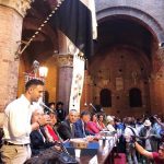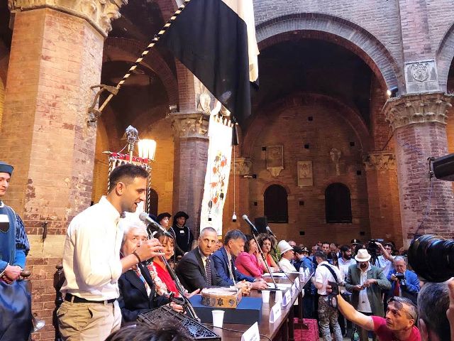 Il drappo di seta, abilmente trattato con un fondo che lo fa sembrare un foglio di carta, è stato riempito da centinaia di persone. Ognuna con una propria mimica. Un’espressione. Una smorfia. La gioia, il dolore, il pathos, che i senesi vivono, racchiusi nella conchiglia di piazza del Campo, mentre il Palio si materializza con i suoi tre giri di corsa.