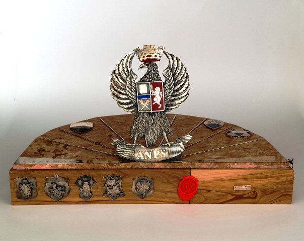 Il Masgalano della Damiani è un lavoro carico di sfumature ed estro, capaci di aggiungere nuovi significati a questo prezioso dono. Così come è ricca di significazione l’aquila, lo stemma dell’Associazione, modellato in plastilina e realizzato in argento con la tecnica della cera persa, in parte smaltata per riproporre il cromatismo originario, e impreziosita da un rubino per rappresentare l’occhio vigile di tutti coloro che stanno al servizio dei cittadini. “Fra la gente. Per la gente”, come recita il motto dell’Associazione riportato sulla scultura.