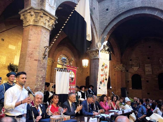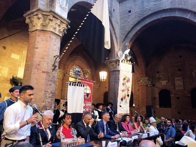 Il drappo di seta, abilmente trattato con un fondo che lo fa sembrare un foglio di carta, è stato riempito da centinaia di persone. Ognuna con una propria mimica. Un’espressione. Una smorfia. La gioia, il dolore, il pathos, che i senesi vivono, racchiusi nella conchiglia di piazza del Campo, mentre il Palio si materializza con i suoi tre giri di corsa.