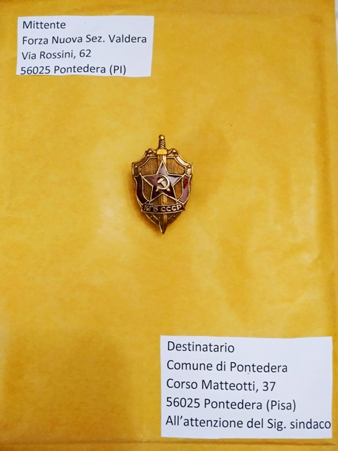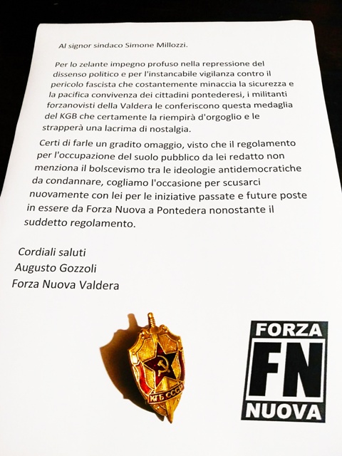 Botta e risposta tra il partito di ultradestra Forza Nuova Valdera e il sindaco di Pontedera Simone Millozzi dopo l'episodio del regolamento per manifestazioni antifasciste sul territorio comunale. Ecco quanto affermato dai primi: "Abbiamo voluto ridicolizzare il bullismo burocratico del sindaco Millozzi e il suo "patentino antifascista" per l'occupazione del suolo pubblico, con un'azione goliardica - dichiara Augusto Gozzoli, segretario provinciale di Forza Nuova -: gli abbiamo spedito una medaglia del KGB accompagnata da una lettera ironica per ricordargli che la sua goffa e isterica repressione non può fermare l'attività di Forza Nuova sul territorio né l'inesorabile tramonto del Partito Democratico. Mentre lui continua imperterrito a parlare di fascismo e antifascismo, compiacendo solo l'ANPI noi continuiamo a parlare di sicurezza e di solidarietà concreta verso i nostri connazionali colpiti dalla crisi e abbandonati dalle istituzioni. Auguriamo al sindaco e ai suoi sodali di godersi i prossimi mesi - conclude Gozzoli - perché tra un anno anche Pontedera seguirà la direzione di Pisa, Siena e Massa".