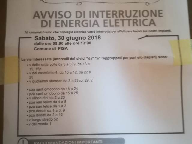 Sabato 30 giugno, prefestivo, giornata del Gioco del Ponte, non è pensabile interrompere l'erogazione dell'energia elettrica dalle 9 alle 13, causando inevitabilmente forti disagi a gran parte delle attività del centro storico di Pisa. Chiediamo all'Enel, sensibile rispetto alle necessità delle attività commerciali, di posticpare questi lavori in altra data. E' questa la richiesta formale che Confcommercio Provincia di Pisa ha inviato all'Enel, che con un avviso distribuito questa mattina, ha informato commercianti e pubblici esercizi delle vie di Borgo Stretto, via delle Sette Volte, via Del Castelletto, via Oberdan, via Ulisse Dini, piazza Sant'Omobono, piazza San Felice, piazza Donati, via del Monte che sabato 30 giugno dalle 9 alle 13 l'energia elettrica verrà interrotta.