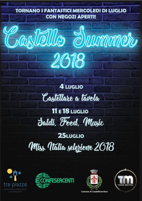 Una lunga tavolata per le vie del Centro Commerciale Naturale scandirà l’avvio mercoledì sera – 4 luglio – di “Castello Summer”, kermesse estiva promossa per il mese di luglio dall’associazione del CCN “Tre Piazze”, dal Comune di Castelfiorentino e da Confesercenti, e che contempla una serie di iniziative nei dopo cena di ogni mercoledì del mese in concomitanza con l’apertura straordinaria dei negozi