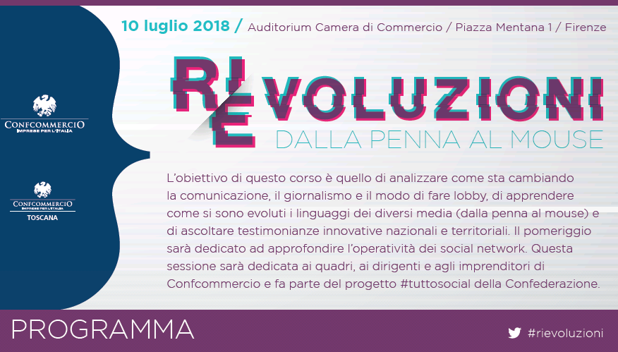 L' "egemonia" del web come sta cambiando la comunicazione, il giornalismo e il modo di fare lobby? E come si sono evoluti i linguaggi dei diversi media, dalla penna al mouse, dalla carta stampata ai social media? A queste ed altre domande risponderanno gli esperti nazionali e territoriali convocati da Confcommercio per la tappa fiorentina di "Rievoluzioni. Dalla penna al mouse", in programma martedì 10 luglio dalle ore 9.45 alle 16 nell'auditorium della Camera di Commercio, in piazza Mentana 1.