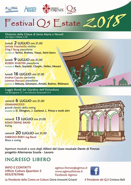 La manifestazione, che prevede sei appuntamenti raccolti sotto il nome di Q5Estate, si inaugura lunedì 2 luglio, alle ore 21.00 presso l’Oratorio della Chiesa di Santa Maria a Novoli (Via Lippi e Macia 10, ingresso libero).