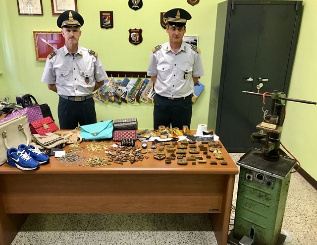 I punzoni metallici in ottone sono stati rinvenuti, nel corso di una accurata perquisizione, dentro la cassetta di scarico del bagno, in una borsa di Dolce&Gabbana, ovviamente contraffatta.