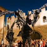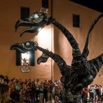 Evocativa del tema 2018, ‘Tra la terra e il cielo’ è in tal senso l’immagine ufficiale del nuovo “Festival del Quarto Teatro”, è un manifesto diverso dal solito, quasi diviso in due come il titolo di questa 31° edizione: “Tra la Terra e il Cielo”. Con i “Saurus” dei Close Act, draghi e streghe che idealmente si librano nell’aria, cui fanno da controcanto e contrappeso gli angeli del Silence Teatro, angeli non divini ma “umani”, scesi a terra per stare a fianco dell’umanità.