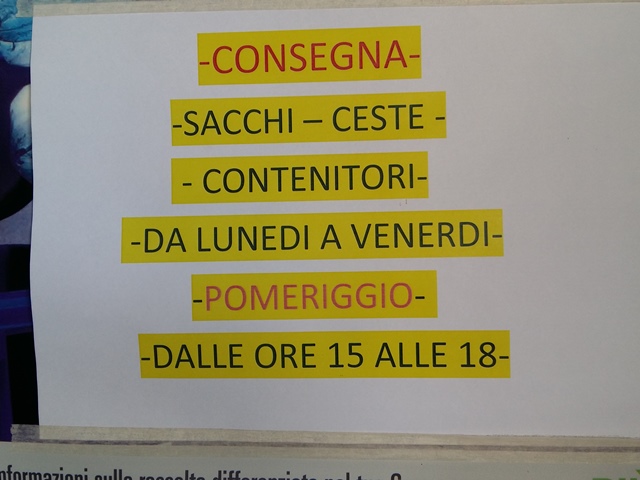 Un sabato mattina il marito della donna si è recato presso il centro per ritirare i sacchi azzurri per la raccolta della plastica, per scoprire sul posto che la consegna non si effettua più nella giornata di sabato. "Erano presenti due orari con cartelli differenti, ma io avevo visto quello giusto", spiega la donna che è dovuto andare dopo il viaggio a vuoto.