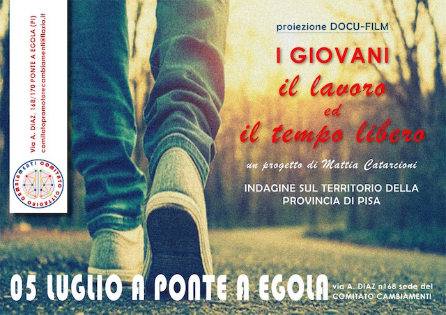 Mercoledì 5 luglio a Ponte a Egola si terrà la presentazione del DocuFilm "I Giovani, il lavoro ed il tempo libero - indagine sul territorio della Provincia di Pisa". Il progetto di Mattia Catarcioni verrà proiettato presso la sede del Comitato Cittadino Elettorale Cambiamenti (Via Diaz 168/170, Ponte a Egola) a partire dalle ore 21:30 nell'ambito della più ambia manifestazione Il Luglio Pontaegolese, alla quale il Comitato parteciperà attivamente, ogni giovedì del mese di Luglio, con eventi, incontri e dibattiti che verranno di volta in volta comunicati.