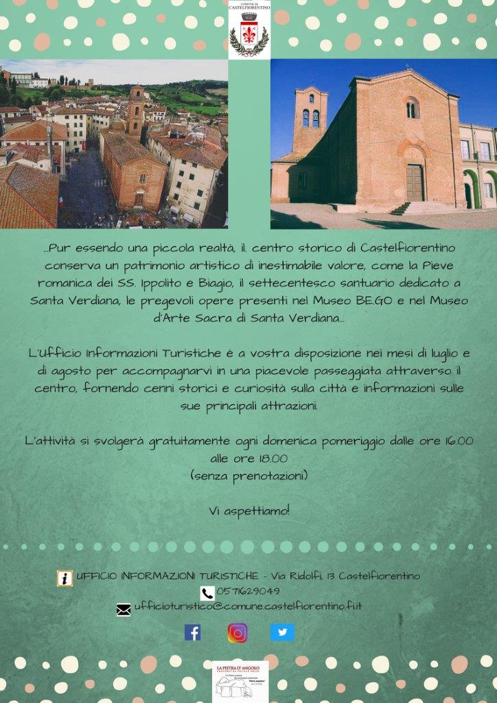 Accompagnare il visitatore alla scoperta di Castelfiorentino, affinché possa conoscere la storia, le curiosità, i musei e i luoghi di interesse che sono presenti nel territorio. E’ questo, in estrema sintesi, il nuovo servizio offerto gratuitamente con guida bilingue (italiano/inglese) dal personale dell’Ufficio Turistico di Castelfiorentino a partire da domenica prossima (8 luglio), e valido per ogni domenica pomeriggio nei mesi di luglio e agosto, i più “caldi” anche in termini di affluenza di visitatori.