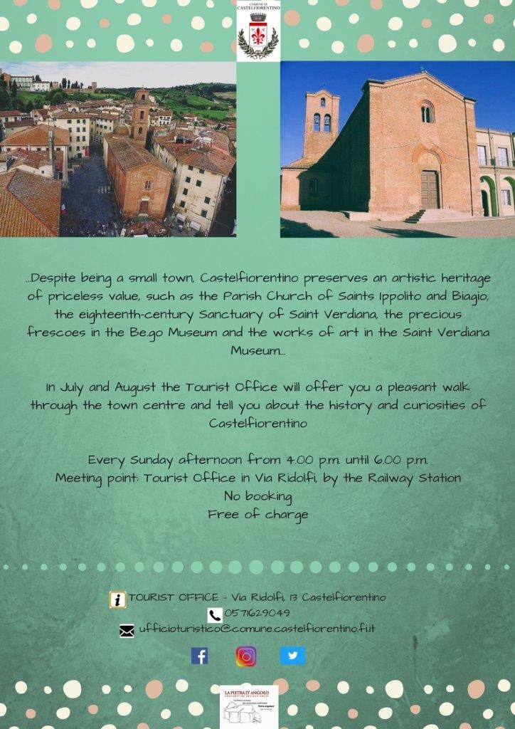 Un servizio che dilata sensibilmente il ruolo informativo tradizionale svolto dall’Ufficio (il più delle volte espletato in sede, con il semplice ausilio di una mappa) invitando il visitatore a partecipare a una piacevole passeggiata, completamente gratuita, nel centro storico del capoluogo, che conserva un patrimonio artistico di inestimabile valore: la Pieve romanica dei SS. Ippolito e Biagio, il Santuario di Santa Verdiana con il Museo d’Arte Sacra, il Museo Benozzo Gozzoli.
