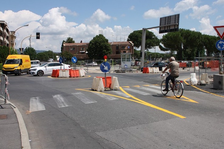 Come da programma sono stati spenti gli impianti semaforici che regolavano il traffico sulla Statale Tosco Romagnola, all’incrocio fra Via Petrarca e Via Bisarnella. Da questa mattina, venerdì 6 luglio, una piccola rotatoria temporanea si trova al centro dell’intersezione e quindi uno dei punti focali della viabilità della città ha subito un cambiamento rilevante.