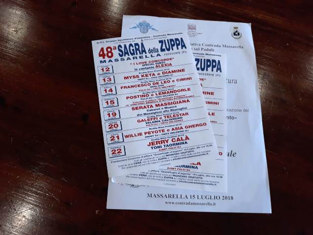 Che cosa hanno in comune Lo Stato Sociale, Gino Paoli, Levante, Calcutta e Franco Califano? Hanno tutti mangiato la zuppa a Massarella. Il perché di così tanti artisti nella frazione di Fucecchio è da ricercare nella Sagra della Zuppa e nel Reality Bites Festival, due realtà che vanno di pari passo da anni e portano in piazza XIII Agosto grandi nomi della musica italiana del passato e del presente (e del futuro...). Da giovedì 12 luglio torna l'appuntamento sui colli massigiani, grazie a Reality Bites e Gruppo Spontaneo d'Iniziativa, con la regia della Contrada Massarella. Il Codacons ha inserito la sagra tra le eccellenze italiane nel progetto Italive.