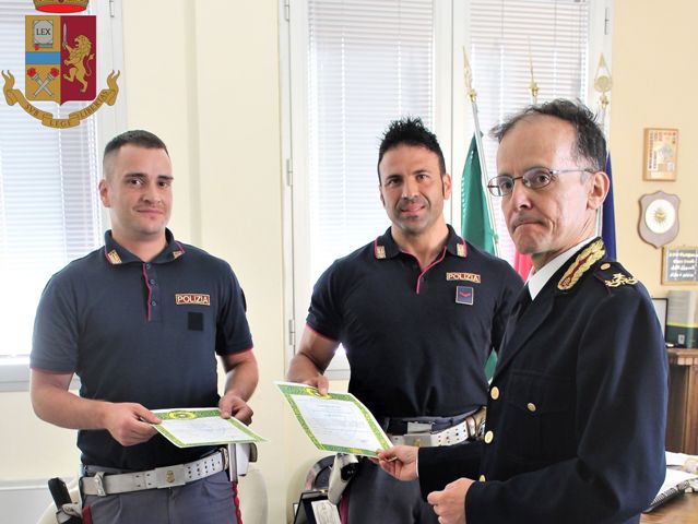 Nel corso della cerimonia a Pedoto e Patellaro è stato consegnato un attestato per aver dato concreta dimostrazione dello spirito di servizio che anima, ogni giorno, le donne e gli uomini della Polizia di Stato.