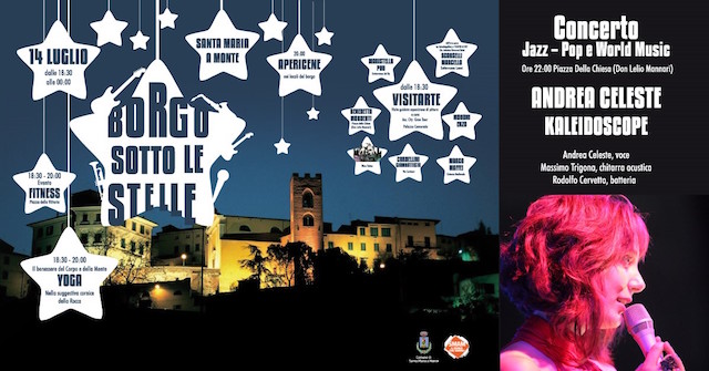 Dalle 20 apericene con prodotti tipici locali nei locali del borgo condurranno il visitatore fino al concerto jazz-Pop e World Music “Kaleidoscope” di Andrea Celeste. In programma alle 22 in Piazza della Chiesa don Lelio Mannari, la cantautrice, originaria di Santa Maria a Monte, stella della serata, si esibirà accompagnata da Massimo Trigona alla chitarra acustica e Rodolfo Cervetto alla batteria.