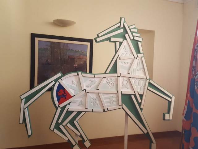 Il cavallo in legno donato al Comune di Fucecchio dal compianto Carlo Taddei, già presidente dell’associazione Fucecchio Riscopre e del Rotary Fucecchio-Santa Croce sull’Arno, fa bella mostra di sé nell’atrio adiacente la sala consiliare in Municipio. L’opera di Taddei è composta dagli stemmi delle 12 Contrade del Palio: 11 di queste sono “spente” mentre la Contrada vincitrice dell’ultima edizione ha il privilegio di essere evidenziata attraverso i propri colori. E così quest’anno tocca alla Contrada Samo. E’ stata recentemente Anna Taddei, nipote di Carlo, ad aggiornare l’opera realizzata dal nonno inserendo la tessera con i colori rossoblù.