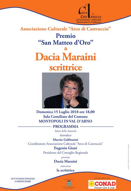 L’associazione culturale ‘Arco di Castruccio’ ha assegnato il Premio ‘San Matteo D’Oro’ alla scrittrice Dacia Maraini. La premiazione si terrà nella sala consiliare del Comune di Montopoli in Val D’Arno il 15 luglio alle 18 presso il giardino del Museo Civico Palazzo Guicciardini a Montopoli in Val d’Arno.