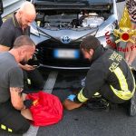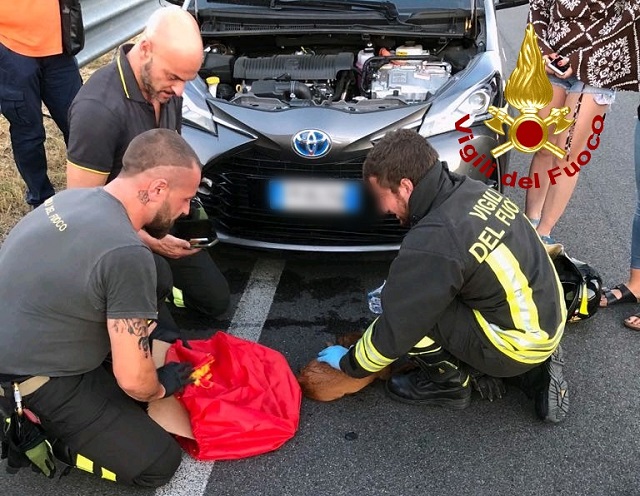 I vigili del fuoco di Arezzo sono intervenuti per soccorrere un cane investito sulla Tangenziale nuova all'altezza di Prada Levanella, rimasto incastrato sotto la mascherina del radiatore di una vettura.