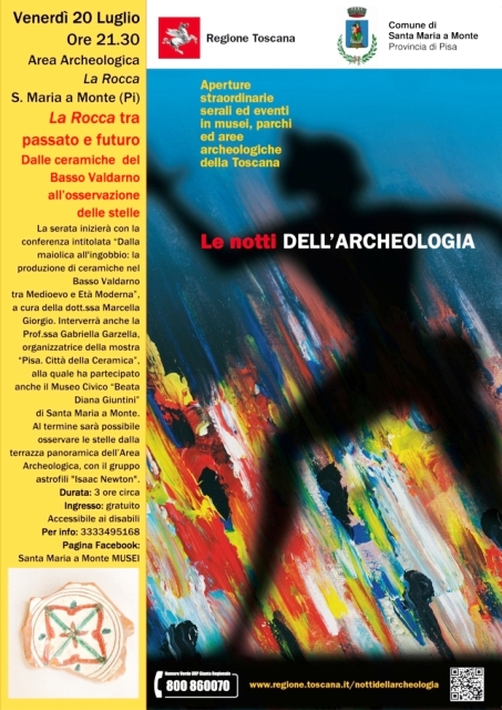 Nel corso degli ultimi due incontri due conferenze porranno l’attenzione su particolari aspetti culturali del territorio. Venerdì 20 Luglio, a partire dalle 21:30, nella cripta dell’Area Archeologica, l’appuntamento è con Le Notti dell’Archeologia: la serata inizierà con la conferenza intitolata “Dalla maiolica all'ingobbio: la produzione di ceramiche nel Basso Valdarno tra Medioevo e Età Moderna”, a cura della dott.ssa Marcella Giorgio, Funzionario Archeologo del Polo Museale della Sardegna. Introdurrà il dibattito la Prof.ssa Gabriella Garzella, Presidente della Società Storica Pisana nonché organizzatrice della mostra “Pisa. Città della Ceramica”. Con più di 500 pezzi esposti, la mostra, alla quale ha aderito anche il Comune di Santa Maria a Monte con il Museo Civico “Beata Diana Giuntini”, è visitabile fino al 5 novembre in quattro sedi espositive principali, tra San Michele degli Scalzi, Palazzo Blu, Camera di Commercio di Pisa e il Museo Nazionale di San Matteo.