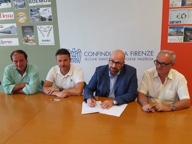 A siglare il patto Michele Pezza, presidente sezione territoriale Empolese Valdelsa di Confindustria Firenze, Paolo Aglietti, coordinatore Cgil Empolese, Fabio Franchi, segretario generale aggiunto Cisl Firenze Prato e Arturo Papini, segretario organizzativo Uil Toscana.