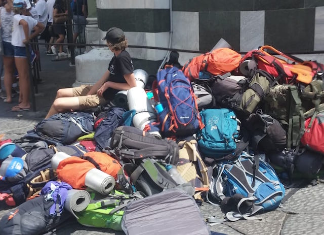 Hanno improvvisato un pic nic a ridosso del Battistero con una montagna di zaini e cibarie, ma la loro bravata è stata interrotta dalla Polizia Municipale. Si tratta di un gruppo di scout scoperto oggi mentre stava bivaccando in piazza del Duomo. Gli agenti del Reparto Antidegrado sono intervenuti oggi intorno alle 14.30: una volta arrivati nella piazza si sono trovati di fronte un cumulo di zaini ammassato a ridosso del Battistero e numerose scatolette di alimenti. Protagonisti della bravata alcuni scout belgi. I ragazzi sono stati richiamati per rimuovere i rifiuti e il responsabile del gruppo, un 22enne della stessa nazionalità, è stato multato con un verbale da 160 euro per violazione del Regolamento di Polizia Urbana.