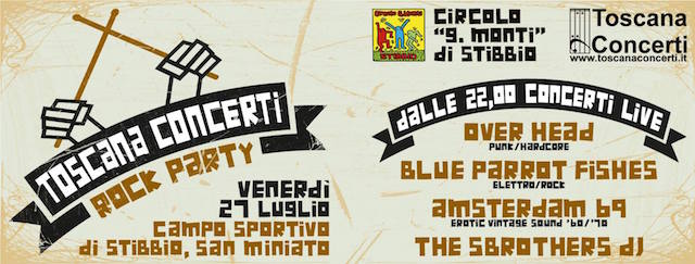 La settima edizione della festa annuale di Toscana Concerti si terrà venerdì 27 luglio dalle 20 al campo sportivo di Stibbio, San Miniato. Il tutto a ingresso gratuito e con la collaborazione del circolo Monti, di seguito il programma.