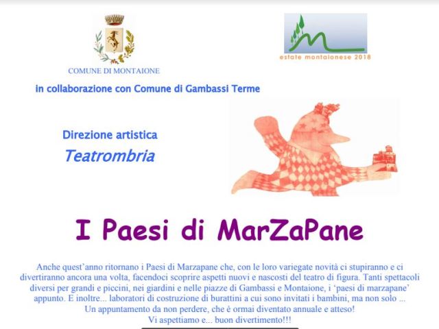 Anche quest’anno ritornano i Paesi di Marzapane che, con le loro variegate novità ci stupiranno e ci divertiranno ancora una volta, facendoci scoprire aspetti nuovi e nascosti del teatro di figura. Tanti spettacoli diversi per grandi e piccini, nei giardini e nelle piazze di Gambassi e Montaione, i ‘paesi di marzapane’ appunto. E inoltre... laboratori di costruzione di burattini a cui sono invitati i bambini, ma non solo ... Un appuntamento da non perdere, che è ormai diventato annuale e atteso! Vi aspettiamo e... buon divertimento!!! Martedì 24 luglio si terrà il primo spettacolo a Montaione alle 21.30 presso Piazza della Repubblica con “Kosimo sugli Alberi”. Insieme agli attori di Teatrombria, la compagnia Blanca Teatro ha scelto di "raccontare", di non accontentarsi del primo risultato raggiunto ma insistere nell'approfondire i motivi e i modi del narrare significhi ricercare, che necessariamente durante questa ricerca di volta in volta il corpo e la parola incontrino l'immagine, i materiali, gli spazi, i tempi, le lingue e i linguaggi e con consapevolezza e curiosità sperimentino.