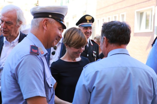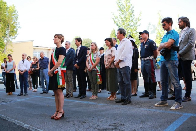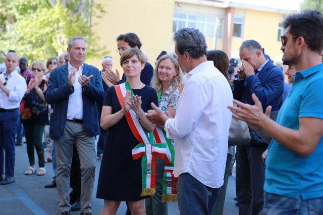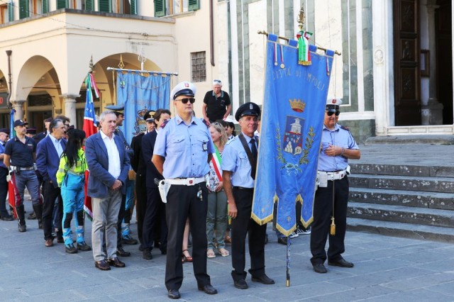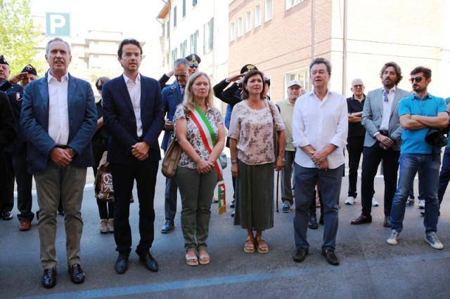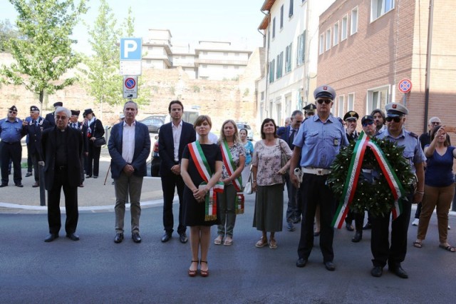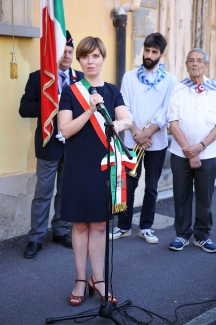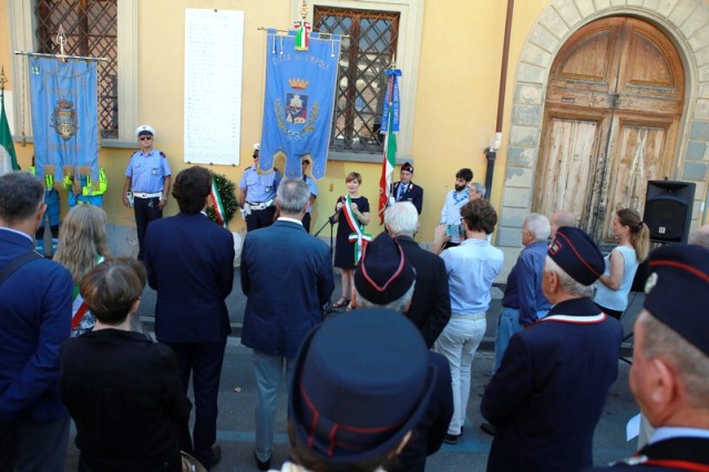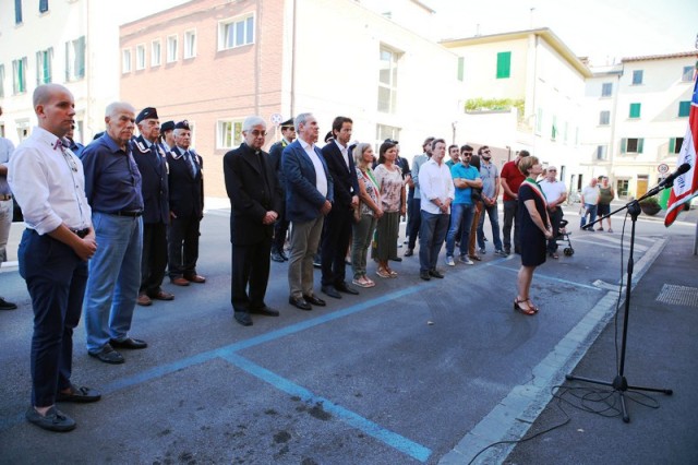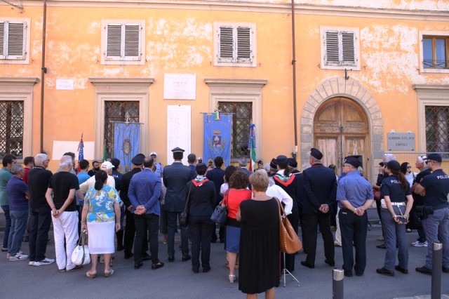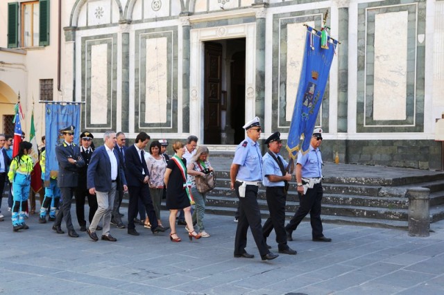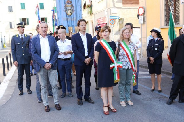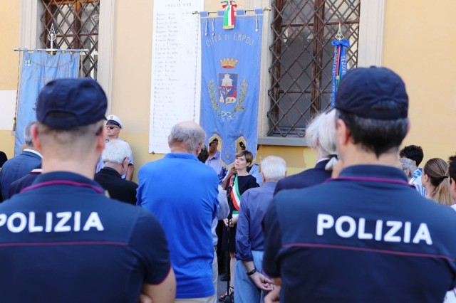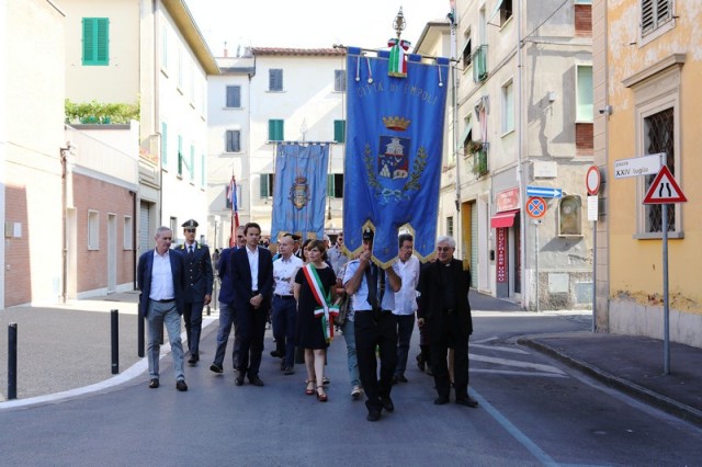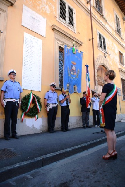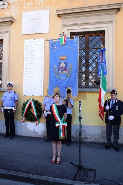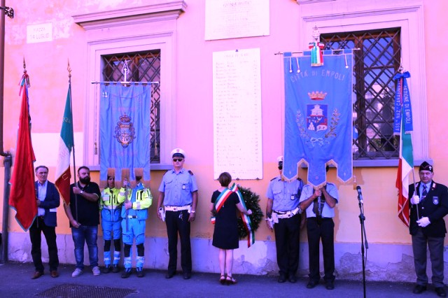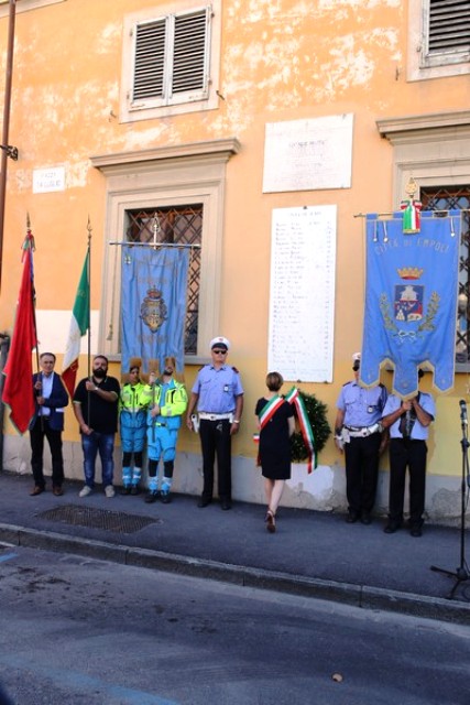 Dopo la messa, il corteo con in testa il gonfalone comunale ha raggiunto piazza 24 luglio e il sindaco Brenda Barnini, a nome dell'amministrazione comunale, ha deposto una corona di alloro alla Lapide-Ricordo.