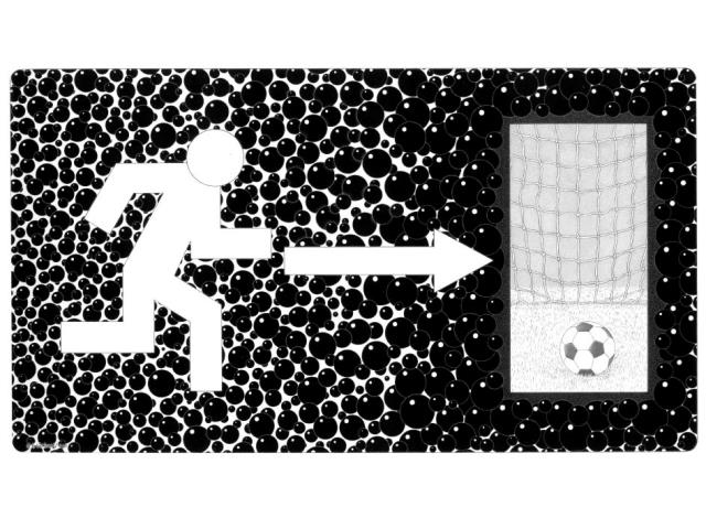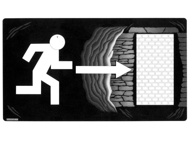 La fiducia nella fuga - sarcastico e drammatico il titolo dei lavori: “Vie d’uscita” - si compie su un tessuto di sintesi proprio dei contenuti della Trappola successiva. Avvolge il protagonista anonimo, ideale e stilizzato - come da cartelli urbani - vuoto nei suoi connotati rispetto alla ridondanza, l’artificio e la ricercatezza del segno che tesse lo sfondo in cui - apparentemente - si muove.
