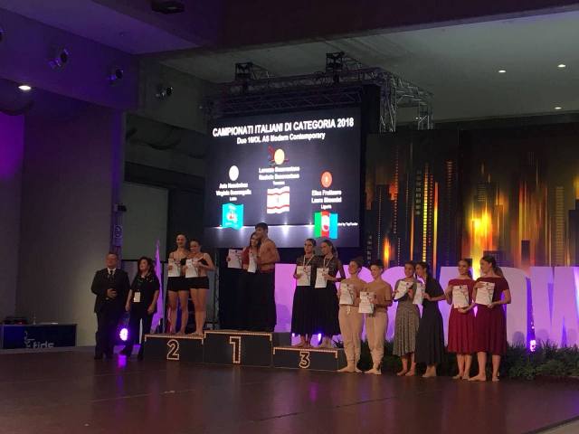 Il 10 e 12 luglio si sono svolti a Rimini i campionati Italiani di Modern Contemporary Dance dove i ballerini della scuola di danza sportiva Jump si sono piazzati al primo posto: Lorenzo Beneventano nell'assolo over 16 classe AS (Lorenzo è già nella nazionale di danza) e primi anche nel duo con la sorella Rachele Beneventano. Elisa Baldi e Giada Morelli hanno ottenuto invece la medaglia d'argento nel duo Modern Contemporary classe A over 16. Un altro bel traguardo per il maestro Franco Marino che allena con passione e dedizione alla danza questi ballerini.