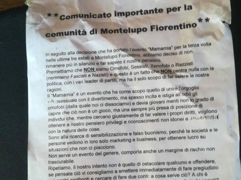 Un volantino anonimo con opinioni fuori controllo, che giustifica posizioni omofobe nonostante venga asserito "non siamo omofobi, sessisti, xenofobi o razzisti". Il foglio A4 è apparso per le strade di Montelupo Fiorentino dopo la serata Mamamia di ieri, martedì 24 luglio. Il noto locale di Torre del Lago da tre anni annovera tra le tappe del colorato tour anche la città della ceramica. Con gusto discutibile e senza firma alcuna, anonimi hanno riportato la loro opinione affermando che il Mamamia "spesso incita e istiga all'odio gli omofobi [...] e devia giovani menti non in grado di capire [...] vogliono ottenere a nostro pensiero privilegi e riconoscimenti non idonei e incompatibili con la natura delle cose".