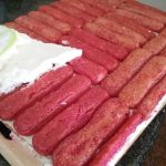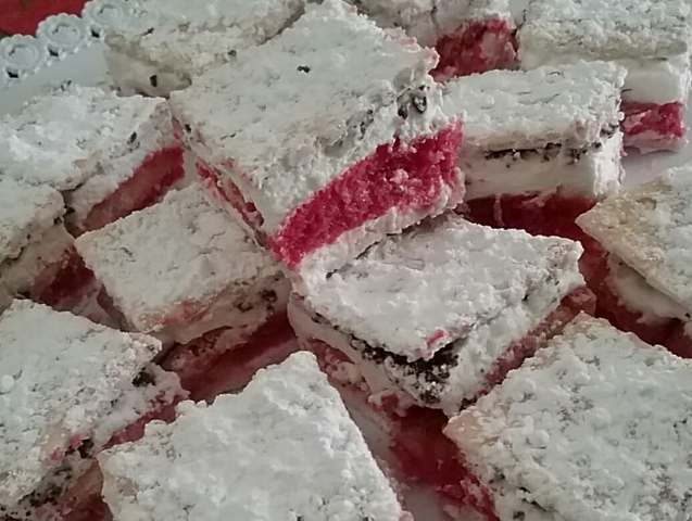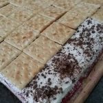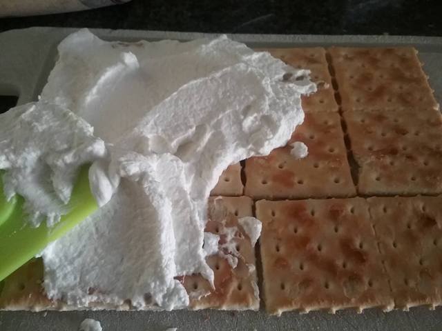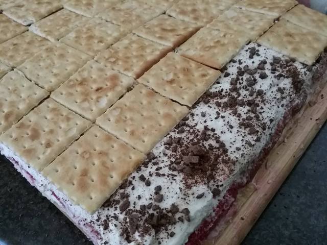 Prendete una pirofila o una teglia ricopritela con carta da forno e fate uno strato con i Cracker, che avrete diviso. Montate la panna e aggiungete lo zucchero a velo e spalmatela sui Cracker. Inzuppare i savoiardi nell' alchermes (potete anche diluirlo con acqua) e disponeteli sopra. Spalmare l'altra metà di panna, mettere granella di cioccolata e ricoprire con i Cracker divisi. Prendere un coltello abbastanza lungo e tagliare tra i Cracker spolverare abbondantemente di zucchero vanigliato, mettere in frigo x 1 ora e poi gustateveli potete anche congelarli che rimangono buonissimi!.