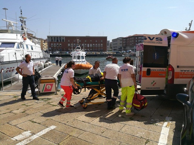 Immediatamente è partita la macchina dei soccorsi coordinati dalla Guardia costiera livornese. Dopo l’imbarco del personale medico, la motovedetta si è recata sul posto. L’uomo, una volta valutatene le condizioni da parte del personale sanitario, è stato stabilizzato su una barella spinale e posizionato sul mezzo nautico della Guardia costiera, appositamente attrezzato per l’imbarco ed il trasporto di traumatizzati. Veloce la navigazione verso la Darsena Vecchia, dove l’infortunato è stato sbarcato. Ad attenderlo, un’ambulanza che lo ha condotto in ospedale per le cure del caso.
