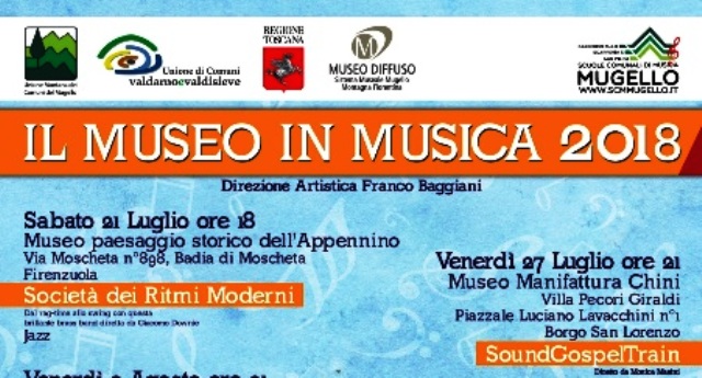 Venerdì 3 agosto alle ore 21 al Museo dei Ferri Taglienti (Palazzo dei Vicari) a Scarperia esibizione del “Duo Cordiera” in musica classica su ritmi spagnoli. Seguono nel mese di agosto: la musica classica del “Quartetto Cherubini” il 24 alle 17,30 al Museo Casa di Giotto (loc. Vespignano) a Vicchio e musiche popolari toscane il 26 alle 17 al Museo Casa d'Erci a Grezzano nel comune di Borgo.
