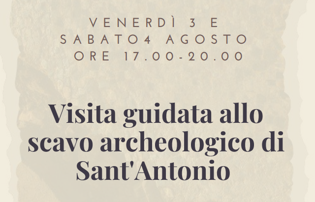 Venerdì 3 e Sabato 4 agosto dalle ore 17.00 sono previste visite guidate gratuite all’area archeologica di Sant’Antonio. Sabato 4 le visite saranno effettuate anche in lingua inglese. In caso di ampia affluenza saranno ripetute più visite durante il pomeriggio. Il ritrovo è presso il cancello d’ingresso allo scavo Loc. Poggio all’ebreo (Baracchino Stradini) con parcheggio consigliato nell’area prospiciente il vigneto lungo la provinciale tra la Cisterna Romana e Poggio all’Aglione. Vietato la sosta lungo la strada provinciale.