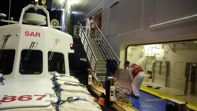 Le operazioni di trasbordo delle due persone, dalla nave alla motovedetta CP 867, sono avvenute non senza difficoltà, a causa delle condizioni fisiche dei due malati, uno dei quali era su una sedia a rotelle. Mezz’ora dopo la mezzanotte, la motovedetta è rientrata in porto, presso la banchina della Capitaneria di porto in Darsena Vecchia, dove ad attendere i due passeggeri erano pronte le autoambulanze del servizio 118 per il loro trasporto all’ospedale di Livorno.