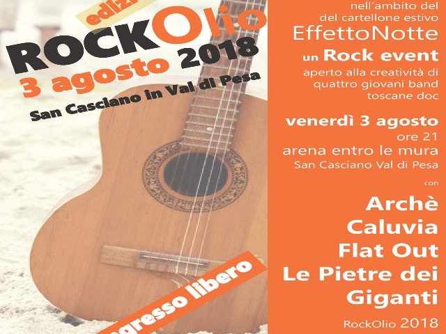 Saliranno sul palco, con questo ordine, la passione, seppur neanche ventenne, degli Archè, band a Km zero di origine sancascianese, il colore e la profondità dei Caluvia che suonano e cantano traendo ispirazione dalle origini latine del loro nome, ‘scintilla di fuoco’, i Flat Out di provenienza senese, band di straordinaria forza musicale e compositiva, risultata vincitrice alla prima edizione di RockOlio, e Le Pietre dei Giganti, band stoner rock, nata solo due anni fa, attratta dallo scenario dell’hard rock. “Ancora una vetrina d’eccezione che mette a in primo piano l’espressività artistica dei giovani – dichiarano gli assessori Chiara Molducci e Roberto Ciappi – RockOlio è l’esempio palese di come intrecciare cultura e turismo, politiche giovanili e tipicità produttiva, una serata speciale che combina due obiettivi, offrire un evento di qualità e creare un’occasione di valorizzazione dei talenti nelle loro diverse fasi evolutive, un ringraziamento particolare all'Accademia Musicale di San Casciano che ci ha fornito alcuni strumenti musicali per la realizzazione dell’iniziativa”. Ingresso libero.