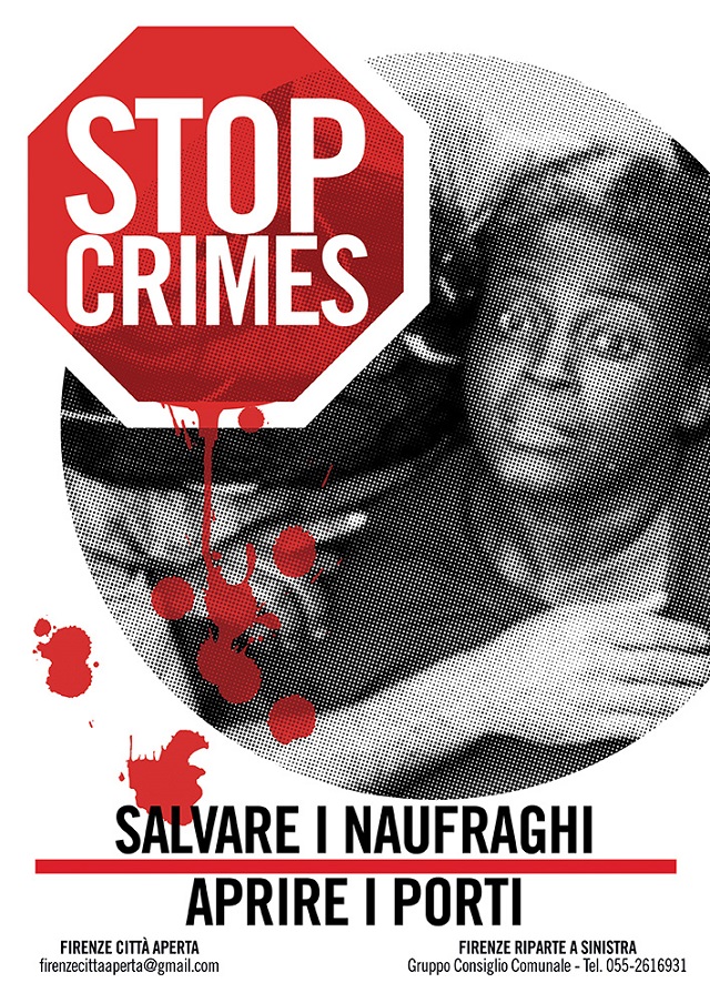 Abbiamo deciso di denunciarla con la rielaborazione dell'immagine simbolo di questa tragedia, gli occhi di Josepha, la donna del Camerun, rimasta per due giorni in mare sostenendosi a galla grazie ad un pezzo di legno, prima che i volontari di Open Arms la ritrovassero al largo della Libia. L'immagine rielaborata dal grafico Alessandro Dilaghi che alleghiamo campeggerà su manifesti, locandine e magliette. Con un messaggio molto semplice - STOP CRIMINI, Salvare i naufraghi e Aprire i porti, e sarà lo strumento per incontri e porta a porta in città, perché come l'Italia non è Salvini, così Firenze non è questo senso comune razzista che oggi è in primo piano (messaggio amplificato dalle azioni e dichiarazioni del sindaco Nardella, le pulsioni peggiori non si blandiscono).