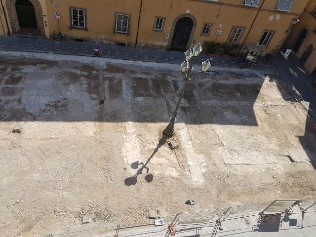 Malgrado l’intervento non preveda un vero e proprio scavo, anche in questo caso la città ha restituito una parte del proprio passato. L’asfalto rimosso infatti poggiava direttamente sui resti di alcune murature, conservate per lo più solo nella parte della fondazione. È quello che resta di un quartiere di età medievale, registrato nella cartografia storica di Lucca e demolito nel 1785 dalla famiglia Bernardini per realizzare la piazza.