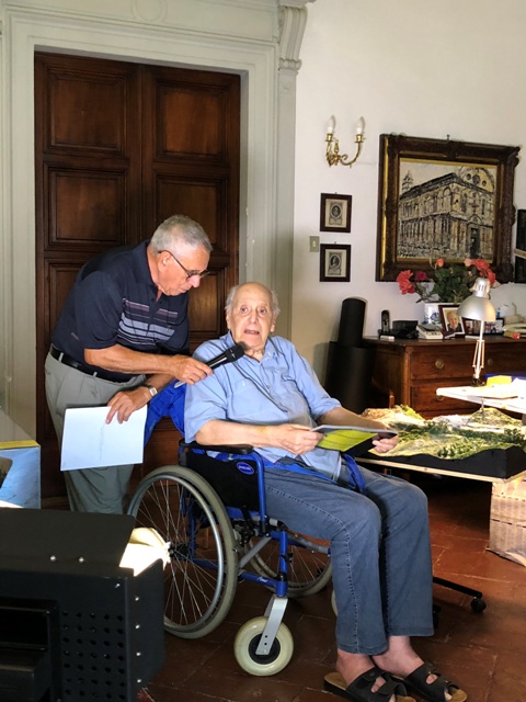 Un momento carico di ricordi e di emozioni quello vissuto ieri a Firenze dal Sindaco Vittorio Gabbanini, che ha incontrato l’Architetto Renato Baldi - cento anni già compiuti - chiamato, poco dopo la laurea con lode, a occuparsi insieme all’Ing. Enrico Brizzi del progetto della ricostruzione della Rocca di San Miniato, distrutta dall’esercito tedesco nella notte del 23 luglio 1944. A San Miniato l’Architetto Baldi dedicò tre anni intensi, dal 1955 quando ebbe l’incarico (per essersi distinto, come racconta alla telecamera che lo riprende, grazie ai piani regolatori della Firenze del dopoguerra) al 1958, quando la nuova costruzione fu finalmente inaugurata. Forte dei documenti e dei dati storici forniti dal Canonico Galli Angelini, in continuo battibecco con la Sovrintendenza pisana (“pretesero che i nuovi mattoni, fatti fare da una fornace riaperta nell’occasione per riprodurre lo stesso impasto degli originali”, fossero a spigolo vivo anziché arrotondato come quelli antichi) e in un tempo record per l’epoca, Renato Baldi portò a casa il risultato per la gioia di tutta la popolazione, che ritrovò così l’amato simbolo della Città. Con orgoglio il figlio Carlo parla delle peculiari competenze del padre, una delle quali “è la geometria descrittiva, oggi sorpassata dal disegno con il cad; partendo dalla foto della Rocca e seguendo un processo inverso chiamato “restituzione”, ricostruì tutti i piani e tutte le facce della torre”. Si trattò di una ricostruzione condotta su ingrandimenti fotografici anche di notevoli dimensioni, dalle quali furono dedotte le principali misure volumetriche e le particolarità strutturali dell’intero edificio, individuandone con esattezza i dettagli architettonici.