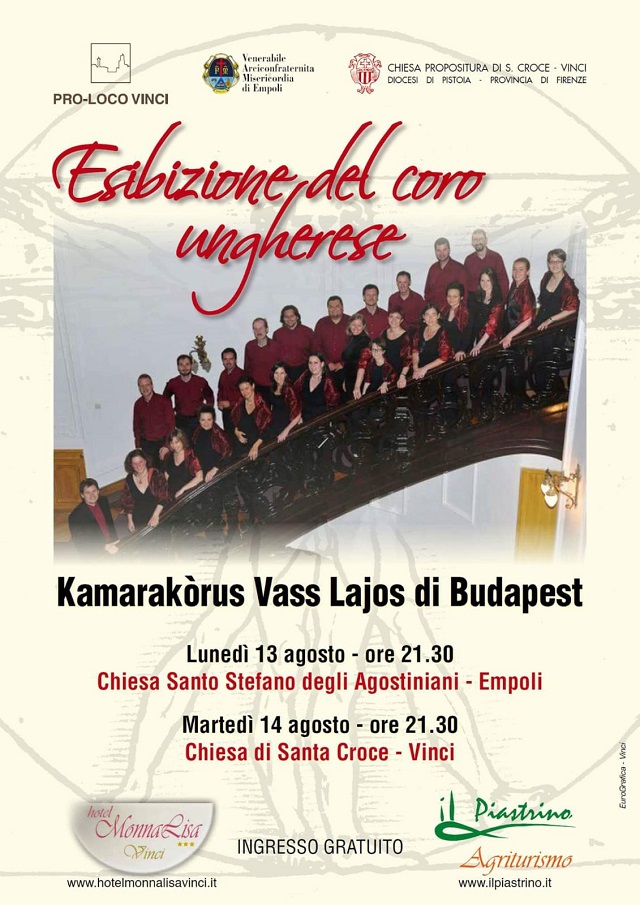 Martedì 14 agosto a Vinci, presso al Chiesa di Santa Croce, si terrà l'esibizione del coro ungherese Kamarakorus Vass Lajos di Budapest con ingresso gratuito.