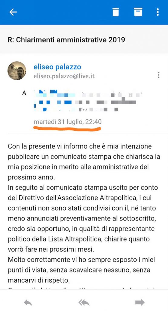 La politica oggi ha sempre più bisogno di correttezza e sincerità e, il Direttivo di Altrapolitica lo sa bene, diversamente da quanto sostenuto ("apprendiamo dalla stampa") avevo già annunciato le mie intenzioni già da diversi giorni - come si evince dagli screenshot delle email inviate rispettivamente ai membri del Direttivo, in data 31 luglio (a cui sono seguite anche risposte da parte dei membri, basti notare la "R" prima dell'oggetto della email) , e agli organi di stampa, in data 8 agosto; perciò il Direttivo ne era pienamente consapevole da giorni. Ragione per cui non capisco il motivo di così tanto scalpore, come a dire che io abbia tradito le attese di qualcuno in particolare.