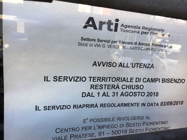 “Il servizio territoriale di Campi Bisenzio resterà chiuso dall’1 al 31 Agosto 2018. Il servizio riaprirà regolarmente in data 3 Settembre 2018. E’ possibile rivolgersi presso il centro per l’impiego di Sesto Fiorentino. “