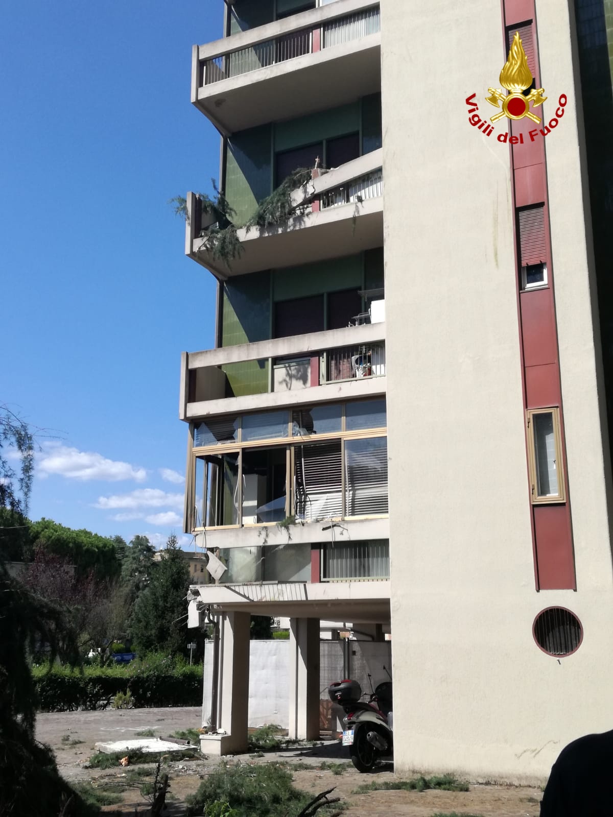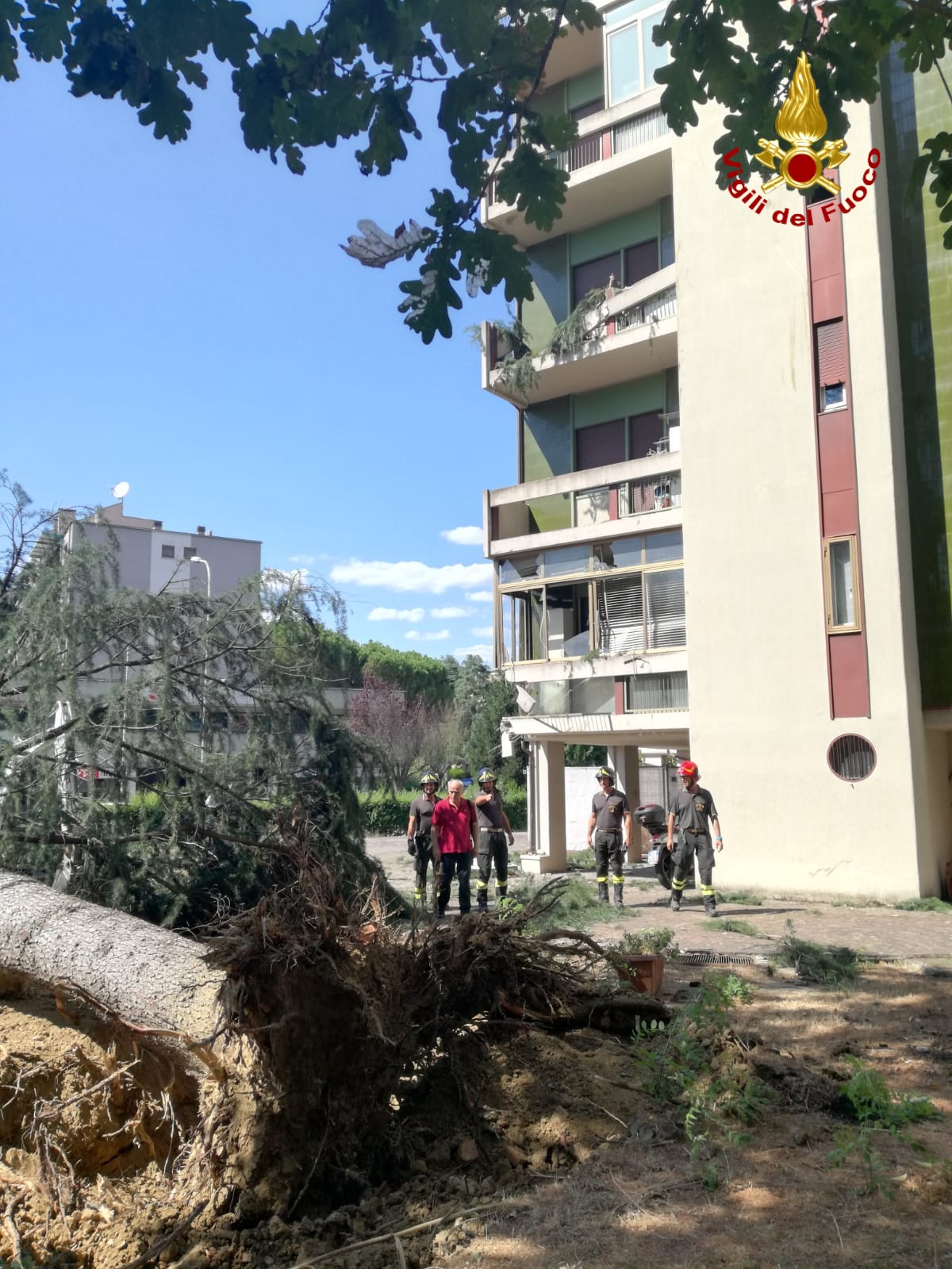 Un grosso albero è caduto su un edificio in via Tiziano ad Arezzo provocando ingenti danni ad alcuni balconi. Uno di questi è stato praticamente distrutto dalla caduta della pianta. Sul posto sono intervenuti i vigili del fuoco di Arezzo. Fortunatamente non ci sarebbero persone coinvolte.