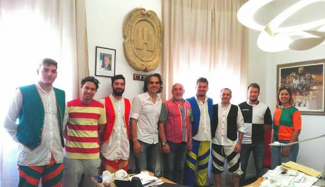 Il Palio di Gambassi Terme entra in Comune, l'ufficialità addirittura nell'ufficio del sindaco Paolo Campinoti con un pezzo del carro vincitore dell'anno scorso che riproduce l'originale stemma in pietra di Gambassi Terme. A consegnarlo ufficialmente i capitani delle 4 contrade e il presidente della Pro Loco Velio Bigazzi.