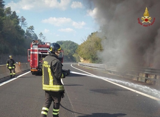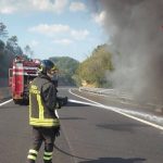 L’incendio si è propagato a della vegetazione sottostante che è stato spento dal personale volontario dell’antincendio boschivo. Per consentire l’operazione di soccorso dei vigili del fuoco la polizia stradale hai interrotto la viabilità.