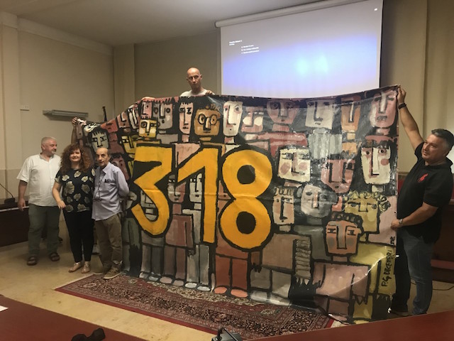 La conferenza stampa di stamani si è conclusa con la donazione alla sindaca Giulia Mugnai di “318” dell’artista Pier Giovanni Decembri (Cima), l’opera a smalto di 4,50 x 2,50 metri che ha campeggiato sul palco del presidio nelle ultime due settimane. L’opera, che rappresenta i 318 operai dello stabilimento Bekaert di Figline sarà collocata all’interno del municipio.