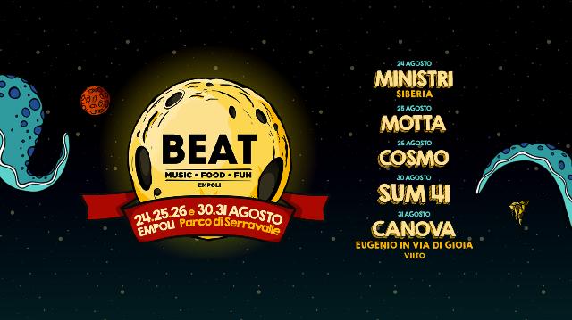 Empoli si prepara per il Beat Festival, giunto alla quarta edizione. Il 24, 25, 26, 30 e 31 agosto il Parco di Serravalle vivrà per due weekend un trionfo di musica, eventi, cibo e molto altro ancora. Saranno cinque giorni intensi, con fischio d'inizio alle 17 e chiusura alle 2 di notte. Si parte coi Ministri, si arriva a Motta, Cosmo, Sum 41 e si chiude con i Canova. Musica di giovani e per giovani, un panorama italiano e internazionale che va ampliandosi e arricchendosi ogni anno di più.