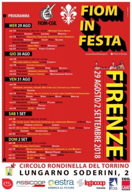 Dopo il successo dell'anno scorso, torna dal 29 agosto al 2 settembre negli spazi del Circolo della Rondinella de Torrino, la Festa della Fiom Cgil di Firenze. Ognuna delle cinque serate vedrà alle ore 18 la presentazione di un libro con autore, alle 19 un dibattito, a seguire la proiezione di un film e musica dal vivo. Non mancheranno gli stand gastronomici, la libreria ed il gioco dei tappi.
