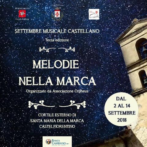“Il Settembre Musicale Castellano” – che contempla numerosi appuntamenti di rilievo fino al 14 settembre, fra cui un concerto del Maggio Musicale Fiorentino (martedì 5 settembre) - è organizzato dall’Associazione Orpheus con il patrocinio del Comune di Castelfiorentino, della Regione Toscana e della Città Metropolitana di Firenze, con il contributo di Banca Cambiano 1884 Spa.